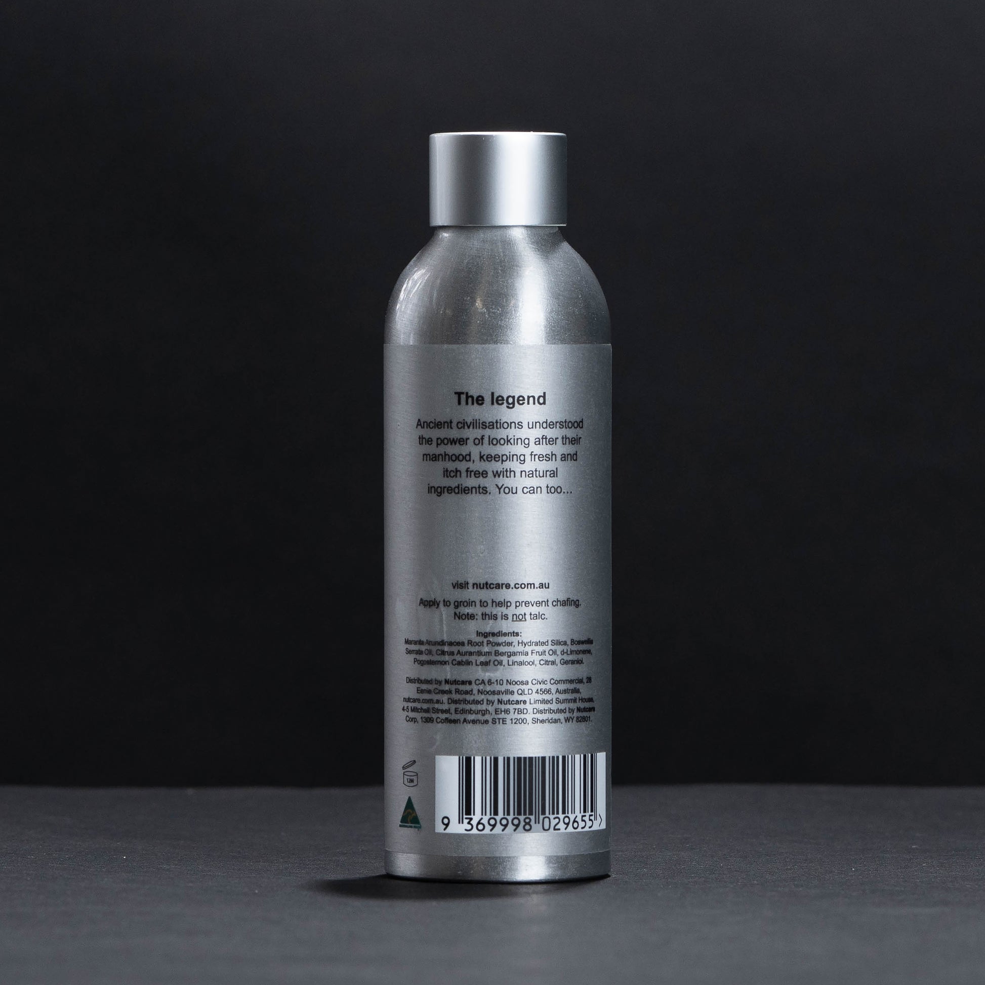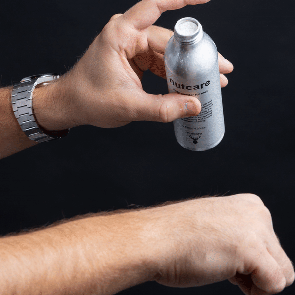 nutcare body powder is a powerful blend of essential oils and friendly powders that combat sweat, chafing, rashes, smells and discomfort. It can be applied all over your body, including on your neck after you shave, arm pits, thighs and of course below your underwear.